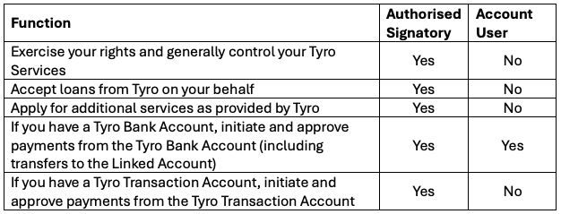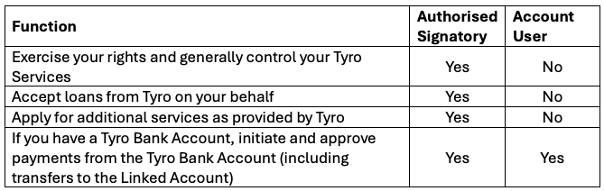 An Account User is able to login to the Tyro App, view balances and obtain statements. Account Users cannot change bank account details, close the account, or add or remove Account Users or Authorised Signatories.