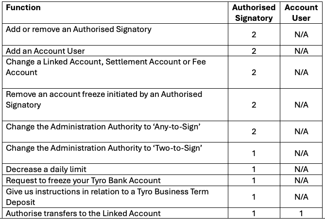 There are two types of users with permissions to act on your account (an Authorised Signatory and an Account User). The number of Authorised Signatories or Account Users required to act depends on your business’ Administration Authority.