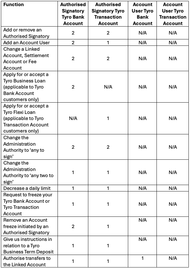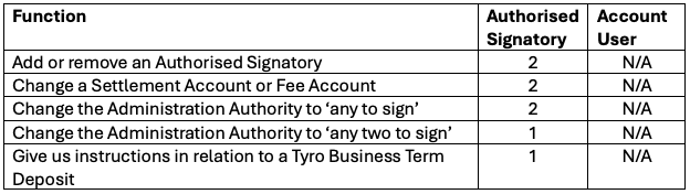 Whether the Administration Authority is “any to sign” or “any two to sign”, where you have more than one Authorised Signatory, the following number of Authorised Signatories or Account Users will be required to perform the functions listed below: